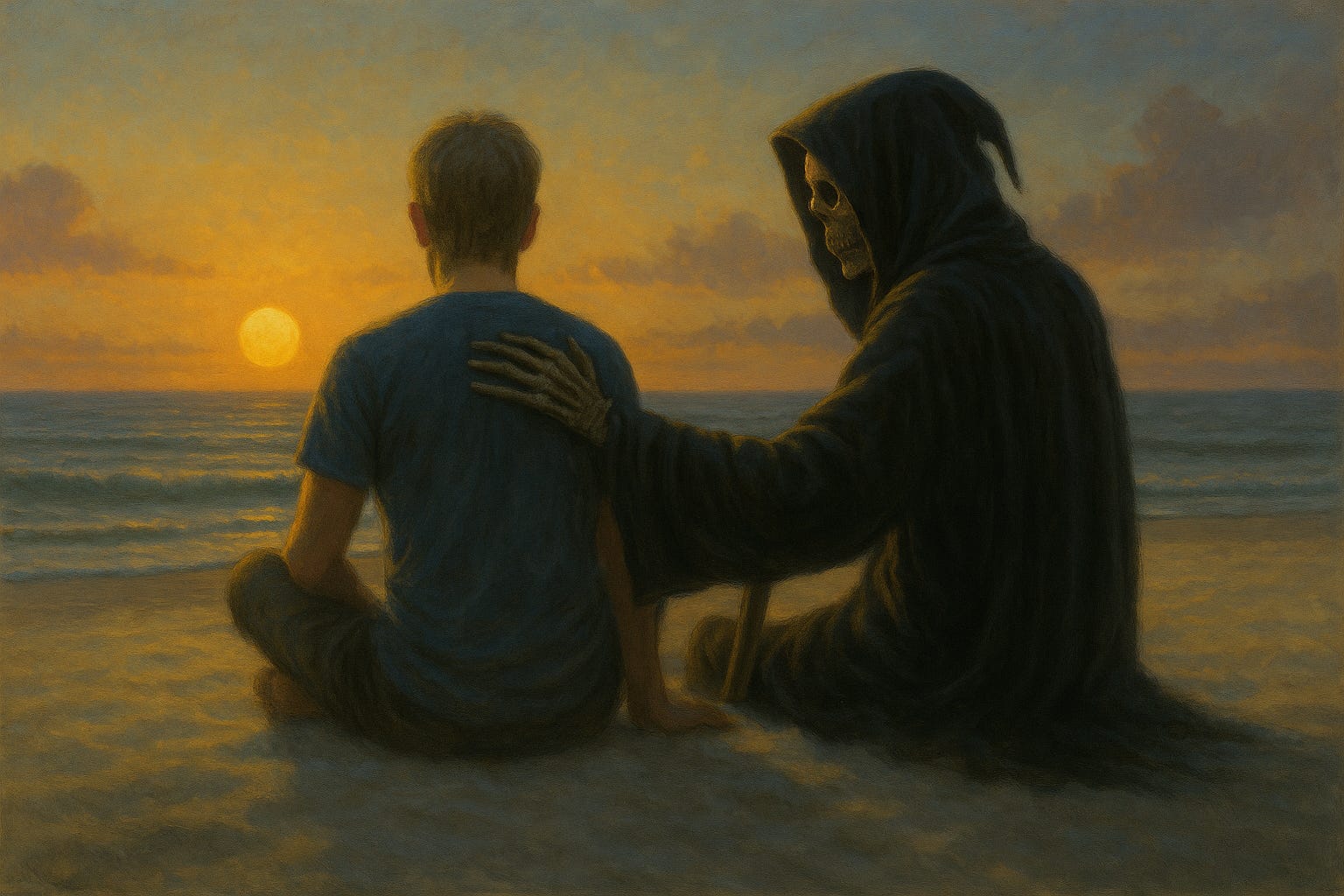 Death stood cloaked in stillness—neither shadow nor light, but something in between—liminal. His presence carried the earthly scent of ancient wood pulled from underground in the chill of winter air. His face was hidden, but it wasn’t cold. He radiated gravity, not malice—like the pull of the tide or the hush before falling into a blackhole.